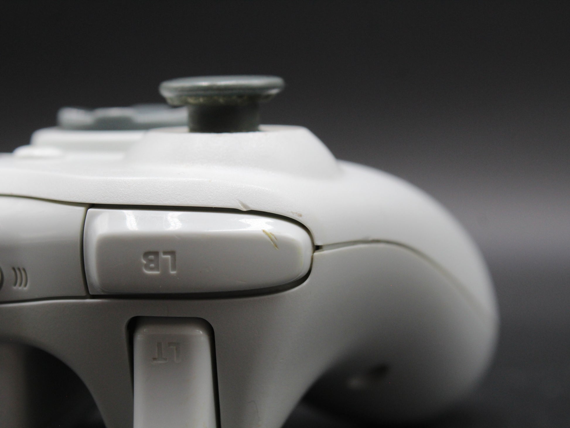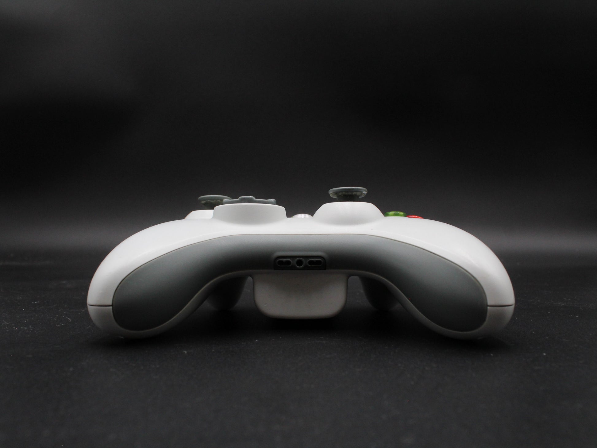 Missing thumbstick caps, Has some yellowing on the back near battery pack and some scratches as pictured